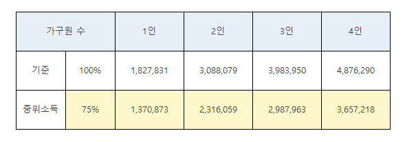 기준 중위소득 75%를 대상으로 하며, 재산기준은 대도시 6억원, 중소도시 3억5천만원, 농어촌 3억원 이하인 경우 신청할 수 있습니다. 금융재산이나 부채는 적용되지 않습니다.